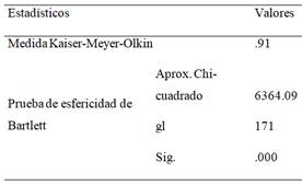 El Análisis Factorial Exploratorio (AFE), considera la matriz de correlaciones de Pearson entre los 22 ítems. El método de extracción considerado fue el de Máxima Verosimilitud y el de rotación Varimax. La medida de adecuación de muestreo Kaiser-Meyer-Olkin (KMO) dio como resultado un valor igual a 0.907, que es satisfactorio (Lloret-Segura, Ferreres-Traver, Hernández-Baeza y Tomás-Marco, 2014) y señala que existe una fuerte interrelación entre los ítems del instrumento. La prueba de esfericidad de Bartlett indica, según los resultados obtenidos (Chi-cuadrado =6609.167, gl: 231, valor-p=.000 < .05), que se rechaza la hipótesis nula establecida de que la matriz de datos es igual a una matriz de identidad y por tanto no existiría colinealidad (Tabla 1). Con respecto al número de ejes a retener, el criterio raíz latente, que deja aquellos factores con autovalores mayores a 1, señala que se deben retener tres factores, ya que a partir del cuarto factor se forma una linealidad en la tendencia; estos tres primeros factores explican un 46.31% de la varianza de los datos originales.