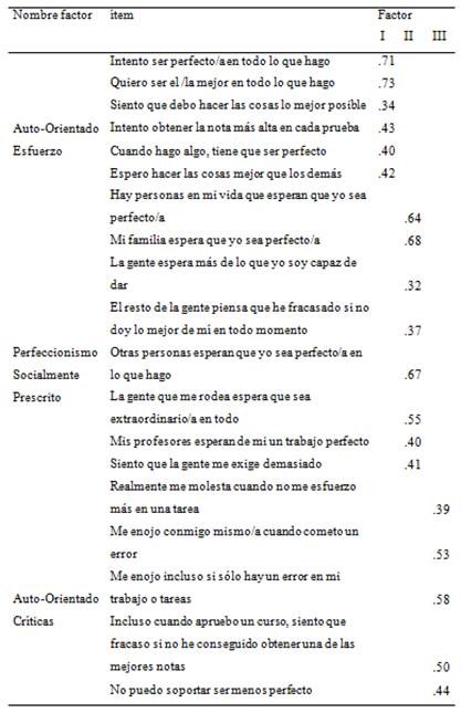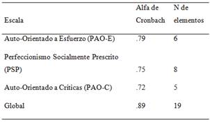 El coeficiente del alfa para el factor Auto-Orientado a Esfuerzo, toma un valor igual a 0.79, para Auto-Orientado Críticas (PAO-C) 0.72 y para Perfeccionismo Socialmente Prescrito (PSP) un valor igual a 0.75; los coeficientes obtenidos son considerados como aceptables (George y Mallery, 2003), (Tabla 3).