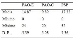Las puntuaciones de consistencia interna fueron de α = 85 para PAO y α = 81 para PSP. El análisis test-retest con un intervalo de cinco semanas mostró adecuados coeficientes de estabilidad temporal que oscilaron entre .66 y .74 para las dimensiones de PAO y PSP, respectivamente. Asimismo, los autores hallaron diferencias sexuales en las puntuaciones medias de la dimensión PSP en favor de los varones (Vicent, 2017).