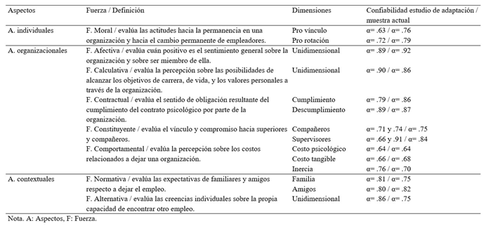 Los aspectos individuales, organizacionales y contextuales fueron evaluados con el Inventário de Motivações para Turnover e Permanência, adaptado al portugués por Oliveira et al. (2016). Inventario tipo Likert que va de uno (totalmente en desacuerdo) a cinco (totalmente de acuerdo), de 88 items que reflejan ocho fuerzas motivacionales para permanecer o salir de la organización actual. Estas ocho fuerzas son operacionalizadas a través de 14 dimensiones, como se detalla en la Tabla 1.