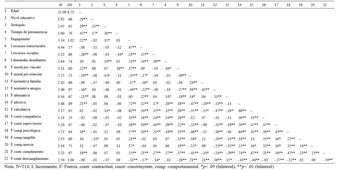 Los datos fueron analizados en dos etapas. Primero se realizaron análisis de correlación de Pearson entre engagement, job crafting (incremento de recursos estructurales, incremento de recursos sociales e incremento de demandas desafiantes), los motivos para permanencia y turnover (fuerzas motivacionales categorizados en aspectos individuales, organizacionales y contextuales) y las variables sociodemográficas (edad, nivel educativo, jerarquía y tiempo de permanencia). Luego se realizaron regresiones jerárquicas controlando el efecto de las variables sociodemográficas, así mismo la inclusión de predictores se realizó de forma independiente para engagement y job crafting a través del método paso a paso.