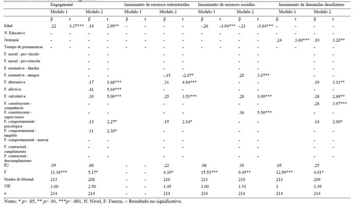 En la Tabla 3 se muestran los modelos de regresión empleados para verificar las hipótesis de predicción. En el primer paso (Modelo 1) fueron incluidas las variables sociodemográficas (edad, nivel educativo, jerarquía y tiempo de permanencia) para controlar su efecto sobre las variables dependientes. Edad mostró estar significativamente asociada a engagement y al incremento de recursos sociales. Nivel de jerarquía alcanzó resultados significativos únicamente en relación al incremento de demandas desafiantes. Tanto el nivel educativo, como el tiempo de permanencia, no lograron resultados significativos con ninguna de las variables dependientes. En el segundo paso (Modelo 2) se adicionaron las variables independientes (aspectos individuales, contextuales y organizacionales), siguiendo el método paso a paso.