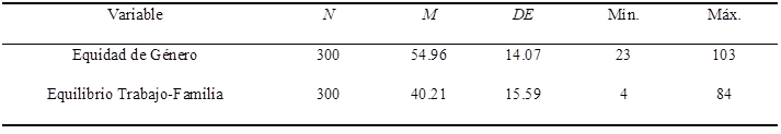 La Tabla 1 muestra los estadísticos descriptivos para la variable Equidad de Género y Equilibrio Trabajo-Familia.