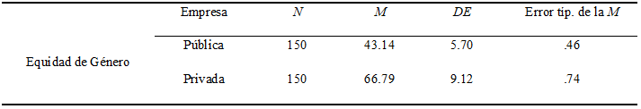 Los resultados obtenidos en este estudio confirman la existencia de diferencias estadísticamente significativas en la Percepción de Equidad de Género entre una empresa pública y privada (p> .05), resultando que, los trabajadores pertenecientes a la empresa privada tienen una mayor percepción de equidad de género que los trabajadores pertenecientes a la empresa pública.