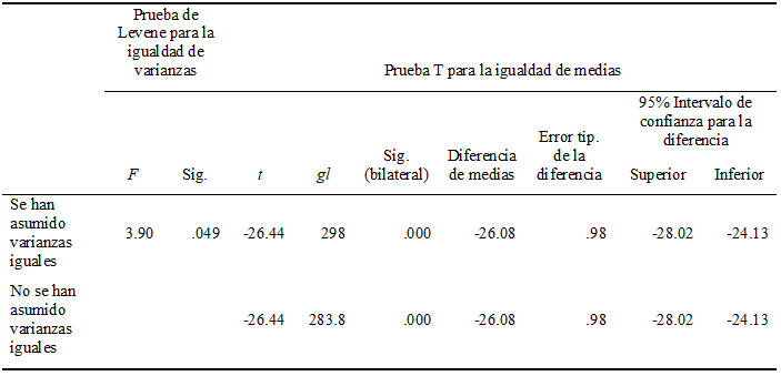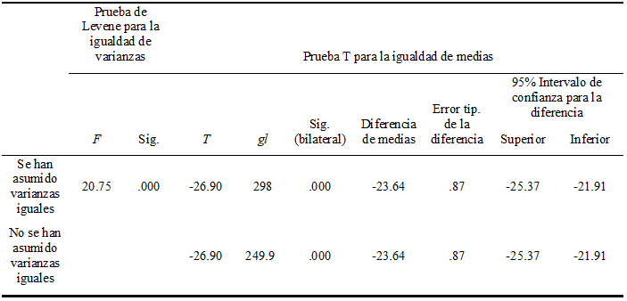 Con respecto a la variable Percepción de Equidad de Género, la empresa pública presenta una media de 43.14 y la empresa privada una media de 66.79 (ver Tabla 2). Por medio del análisis realizado mediante la prueba T para muestras independientes en la que se ha asumido desigualdad de varianza (F= 20.75; p< .05) es posible señalar que existen diferencias estadísticamente significativas en relación a la Percepción de Equidad de Género entre la empresa pública y otra privada (t= -26.90; p< .05) (ver Tabla 3).