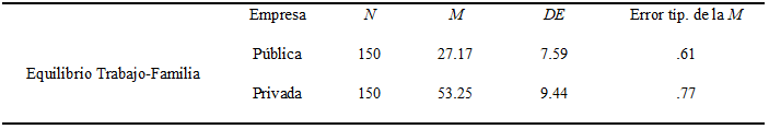 Los resultados expuestos en este estudio confirman la existencia de diferencias estadísticamente significativas en relación al Equilibrio Trabajo-Familia entre una empresa pública y otra privada (p> .05), resultando que, los trabajadores pertenecientes a la empresa privada reportan un mayor equilibrio trabajo-familia que los trabajadores pertenecientes a la empresa pública.
