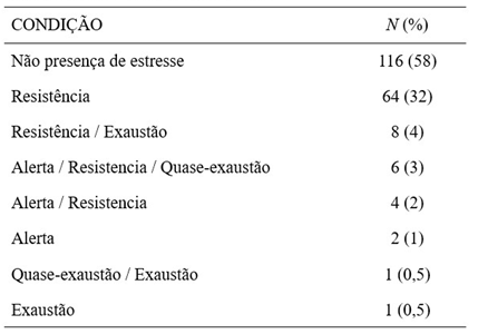Quanto às respostas para o Estresse, cerca de 42% da amostra apresentou estresse em alguma fase (alerta, resistência, quase-exaustão ou exaustão), estando a maioria na fase de Resistência (32%). Vários participantes relataram sintomas acima dos limites em mais de uma fase (Tabela 1). Neste caso, Lipp (2000) indica que o estresse está em processo de agravamento e que deve, em breve, caso não haja nenhuma intervenção, se agravar para a fase seguinte. Um teste do Qui-quadrado indicou que os indicadores de saúde mental não variaram significativamente entre as categorias profissionais (p > ,005).