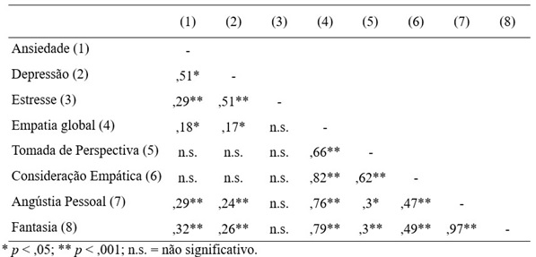 Conforme esperado, todas as dimensões da Empatia se correlacionaram positivamente entre si e com a Empatia Global (Tabela 2). Além disso, foi verificada a existência de correlações positivas entre Ansiedade e Depressão com a Empatia Global e de correlações positivas entre Angustia Pessoal e Fantasia com Ansiedade e Depressão.