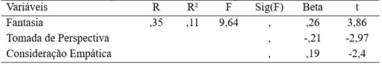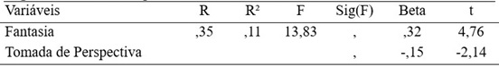 Para testar em que medida as dimensões de Empatia poderiam ser usadas como preditoras da Ansiedade e da Depressão, foram realizadas análises de regressão múltipla (método stepwise), tendo como variáveis dependentes Ansiedade e Depressão, e a Angustia Pessoal, Tomada de Perspectiva, Consideração Empática e Fantasia como variáveis independentes. Os resultados apresentados nas Tabelas 3 e 4 indicam que a Ansiedade foi predita positivamente por Fantasia e inversamente por Tomada de Perspectiva, com ambas explicando cerca de 11% da variância total observada. Além disso, a Depressão foi predita de forma positiva por Fantasia e Consideração Empática, e inversamente por Tomada de Perspectiva.