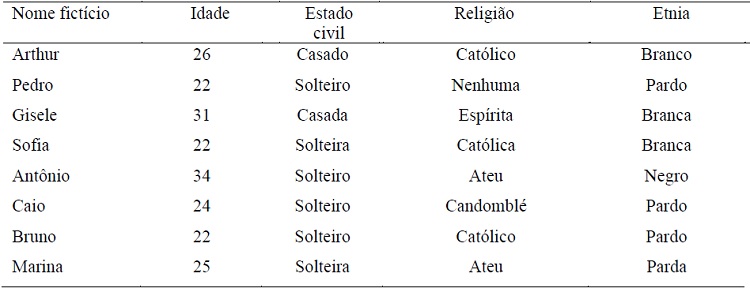 Na caracterização dos participantes foram utilizados nomes fictícios. As idades variaram de 22 a 34 anos, sendo dois casados e seis solteiros, como pode-se observar na Tabela 1, que também traz dados acerca da religião e da etnia.