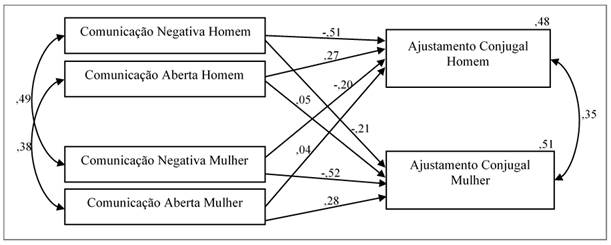 O primeiro aspecto elucidado se refere à associação entre a forma de se comunicar dos casais. Tal se observa por meio da covariância entre o estilo de comunicação negativa do marido e da esposa, da mesma forma como ocorre com o estilo de comunicação aberta e com o ajustamento conjugal, covariância entre os erros. O resultado dessas covariâncias indica que se ocorre alteração na forma de se comunicar, negativa e/ou aberta, e no ajustamento conjugal de um membro da díade, a mudança provocará alteração diretamente proporcional na forma de se comunicar e no ajustamento conjugal do parceiro.