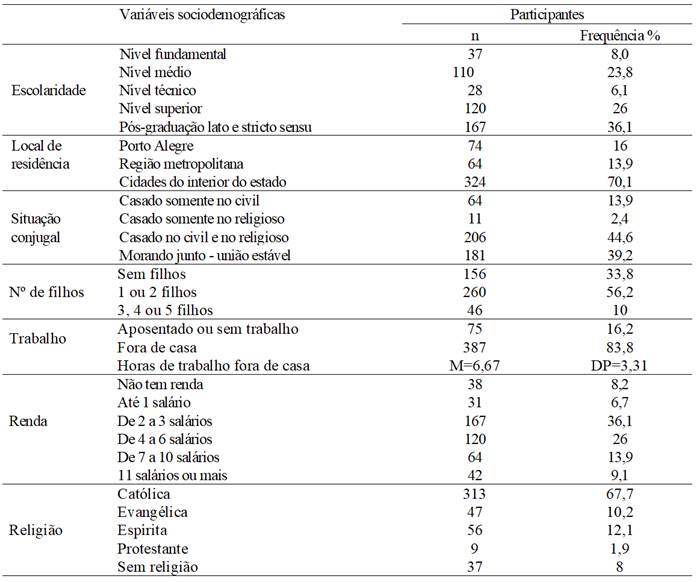 Os participantes deste estudo foram 231 casais heterossexuais (462 indivíduos). A idade mínima dos respondentes foi de 18 anos e a máxima de 79 anos (M=41,41; DP=12,40), e o tempo de união variou de 6 meses a 53 anos (M = 15,15; DP = 12,05). Outras informações sociodemográficas da amostra constam na Tabela 1.