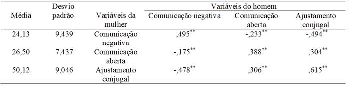 Por meio dos testes iniciais foi possível inferir a interdependência entre os membros da díade, conforme pode ser observado na Tabela 2 em que são apresentadas médias, desvios padrão e correlações entre as escalas de comunicação e o R-DAS para homens e mulheres.
