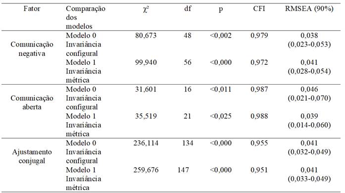 O teste de invariância das cargas fatoriais para os dois grupos é apresentado na Tabela 3. Ao comparar a invariância configural no modelo 0 sem restrição e a invariância métrica no modelo 1 com restrição das cargas fatoriais verifica-se que a diferença no índice de comparação de ajuste (Comparative Fit Index - CFI), não foi superior a 0,010 para nenhum dos fatores.
