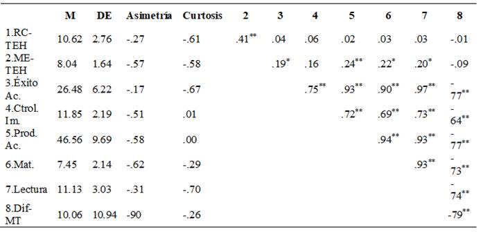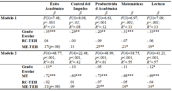 En el primer modelo (ver Tabla 2) se introdujo el grado escolar como variable de control -debido a los resultados del ANOVA factorial- y las estrategias de regulación emocional, y en el segundo se adicionó las dif-MT como otra variable de control. De esta manera, puede observarse el cambio en la capacidad explicativa de ambos modelos, donde si bien la del modelo general aumenta, la de las estrategias disminuye; pero la asociación se mantiene. La mayor capacidad predictiva estuvo dada por las dif-MT. La regulación emocional se asoció únicamente mediante la estrategia ME-TEH con las dimensiones del DA productividad, matemática y lectura, marginalmente con éxito académico y no lo hizo con control del impulso.