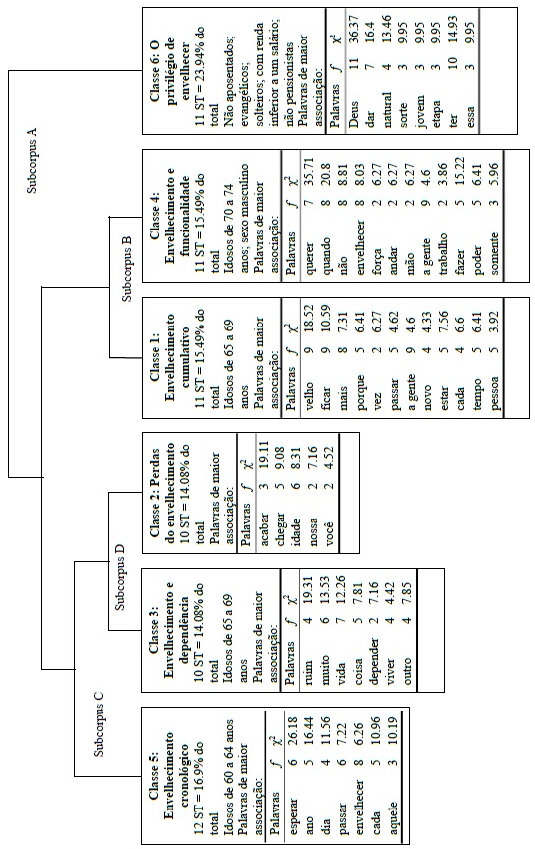 Já o subcorpus B, denominado “Envelhecimento: uma série de mudanças”, composto pelas Classes 1 (Envelhecimento cumulativo), 4 (Envelhecimento e funcionalidade), retrata esse processo ininterrupto, em que ocorrem algumas mudanças físicas e nos papéis sociais, que impactam as atividades desempenhadas pelos idosos, tendo como consequência uma redução destas. O subcorpus C, nomeado “Envelhecimento: um continuum”, constituído pela Classe 5 (Envelhecimento cronológico), apresenta uma concepção do envelhecimento como um processo contínuo no tempo, o qual resulta em um processo cumulativo, que tem como produto final o idoso.