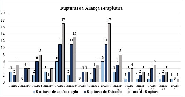 Constatou-se que as rupturas (de confrontação e evitação) apresentaram, em média, alguma significância sobre a AT (M= 3,0; DP= 0,62). Em todas as sessões, as rupturas tiveram ao menos algum impacto na AT (pontuação de pelo menos 3,0). Nas sessões 5, 6, 9, 13 e 14 houve presença de rupturas com alto impacto (pontuação 5,0). As sessões que apresentaram, em média, maior impacto na AT foram a 12 (M= 3,7; DP= 1,10), 13 (M= 4,2; DP= 1,10) e 14 (M= 4,0; DP= 1,10).