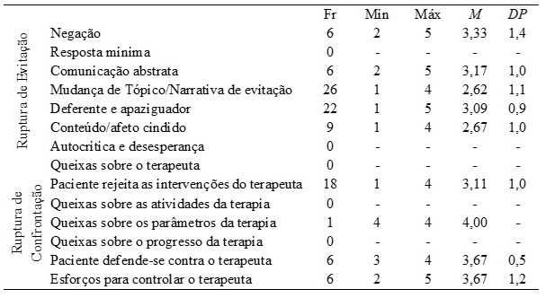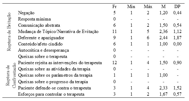 As rupturas de evitação com maior frequência média ao longo do tratamento foram: mudança de tópico/narrativa de evitação (Fr= 11), deferente e apaziguador (Fr= 9), e comunicação abstrata (Fr= 6). Já as rupturas de confrontação predominantes foram: paciente rejeita a intervenção do terapeuta (Fr= 12), defende-se contra o terapeuta (Fr= 3) e faz esforços para controlar o terapeuta (Fr= 3). As demais frequências das rupturas podem ser verificadas na Tabela 1.