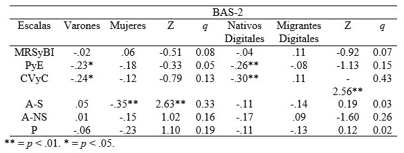 Se calcularon el coeficiente de correlación r de Pearson, posteriormente la Z de Fisher y el coeficiente q de Cohen de la magnitud del efecto de las diferencias de correlaciones, a fin de analizar si existían diferencias por sexo, así como entre el grupo de nativos digitales (de 18 a 30 años) y el grupo de migrantes digitales (de 31 a 65 años) (ver Tabla 2).