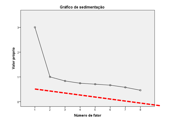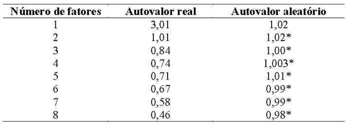 O Critério de Kaiser apresentou dois fatores, e o de Cattell (Figura 1) mostrou uma adequação com uma única dimensão. Para obter maior clareza a respeito da dimensionalidade dos itens, optou-se por realizar uma análise paralela, que permitiu a comparação dos valores dos dados reais com os dos dados aleatórios, com isso foi retirado apenas um fator no qual o autovalor dos dados reais era maior que dos dados aleatórios (Tabela 2).