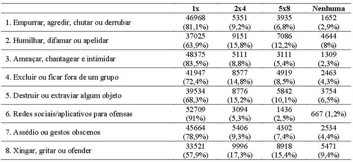 Já ao que se refere às quatro menos frequentes, a quinta em menor prevalência é a violência psicológica (ameaçar, chantagear e intimidar), seguida da violência sexual (assédio ou gestos obscenos) a sexta em menor frequência; já a sétima, a de menor frequência segundo a pesquisa é a violência virtual (redes sociais/aplicativos usados para ofensas) e a oitava em menor prevalência é a violência física (empurrar, agredir, chutar ou derrubar).