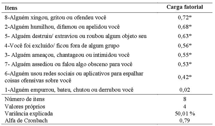 Como pode ser observado na Tabela 3, todos os itens apresentaram cargas fatoriais acima do recomendado, com exceção do item “Alguém empurrou, bateu, chutou ou derrubou você”, que apresentou carga fatorial abaixo de 0,35, motivo pelo qual foi excluído. O questionário, portanto, ficou constituído por apenas 7 itens. Os itens apresentaram cargas fatoriais que variaram de 0,418 “Alguém usou redes sociais ou aplicativos para espalhar coisas ofensivas sobre você” a 0,722 “Alguém xingou, gritou ou ofendeu você”. Quanto a consistência interna, levou-se em conta o alfa de Cronbach, que se mostrou meritório (α = 0,79). Em suma, tendo o item 8 eliminado, o instrumento ficou composto por um fator com 7 itens.