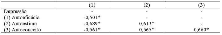 Análises de correlação de Pearson apontaram que os escores das variáveis mensuradas obtiveram uma correlação estatisticamente significativa (p < 0,001), atendendo pressuposto para realização da regressão linear. A Tabela 1 apresenta os coeficientes de correlação entre depressão, autoeficácia, autoestima e autoconceito.