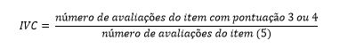 O grau de concordância entre os juízes nos critérios ‘a’ a ‘f’ do Protocolo de avaliação do programa foi aferido a partir do Índice de Validade de Conteúdo (IVC), sendo considerados satisfatórios valores a partir de 0,8. Usou-se a fórmula: