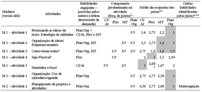 A Tabela 1 ilustra a análise de conteúdo realizada pelos juízes em relação a cada atividade do programa. Dada a complexidade das tarefas e a dificuldade de isolar um único componente executivo, optou-se por uma análise mais abrangente dos juízes, os quais poderiam identificar as diversas demandas executivas das atividades propostas, enumerando-as da maior demanda para a menor (demanda primária = 1; secundária = 2 e sucessivamente). A tabela mostra tanto os componentes predominantes identificados (aqueles identificados como demanda primária, portanto 1) como a média dessas respostas a cada habilidade.