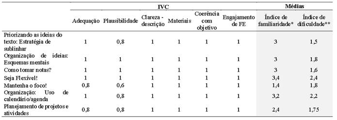 Os índices de familiaridade (critério g) e dificuldade foram obtidos a partir da média aritmética das pontuações atribuídas pelos juízes a cada item. Para o estudo piloto, são apresentadas as pontuações, tal como atribuídas pelo participante-docente a cada item do Protocolo de estudo piloto, acrescidas de suas observações qualitativas.