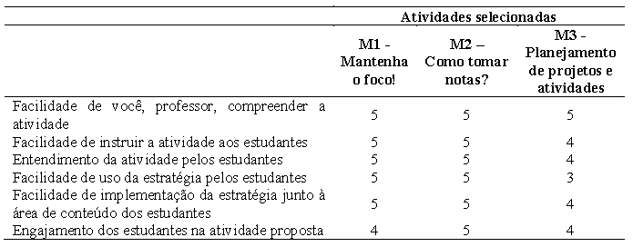 Imediatamente após aplicação, o professor-aplicador preencheu o Protocolo de estudo piloto. Os resultados constam na Tabela 4. De forma geral, as estratégias foram positivamente avaliadas, pelo docente, em todos os critérios. A atividade do Módulo 3 foi apontada como mediana no critério ‘Facilidade de uso da estratégia pelos estudantes’. De fato, a atividade introduz uso de estratégias como organizadores e folhas de planejamento que podem ser de pouca familiaridade aos estudantes, daí a maior dificuldade em seu uso. No entanto, deve-se destacar que essa avaliação se deu a partir de uma aplicação mais pontual e que o uso repetido da estratégia ao longo do semestre deve consolidar seu uso. De qualquer forma, revisão foi realizada na descrição da atividade, de modo a fortalecer a ação do professor como mediador nas primeiras etapas de implementação.