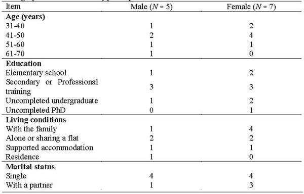 All the interviewees were Spanish from Catalonia; they were not working at the time of the interview and were receiving benefit, although ten of them had been previously employed. The economic level varied greatly, depending on the family income and how they share it. The period of participation in Nikosia ranged from at least six months to twelve years. The interviewees have been through mental health services at least within the last twelve years and one participant had lived for forty years in a psychiatric hospital. Most of them considered themselves in a stable phase of the mental ill-health and a few perceived themselves as recovered. Participants received the following diagnoses of mental disorder: Schizophrenia (5), bipolarity (3), depression (2), and borderline personality disorder (2).