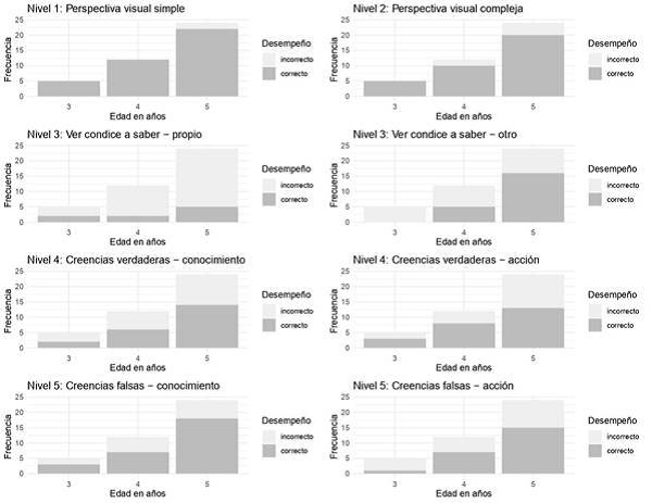 Respecto a las evidencias empíricas sobre la progresión de estas habilidades, algunos autores han encontrado que a los 3 años niños de desarrollo típico ya han desarrollado el primer nivel de perspectiva visual simple (Gjerde et al., 1986; Poulin-Dubois et al., 2007), pero no el segundo, el cual no se alcanzaría hasta los 4 años (Bigelow & Dugas, 2008; Flavell, 1978; Masangkay et al., 1974). En cuanto a los niveles 3 y 4 parece existir cierto acuerdo en que suelen emerger entre los 3 y 4 años (Baron-Cohen, 2001; Pratt & Bryant, 1990; Wellman & Liu, 2004). Por otra parte, algunos estudios apuntan que el nivel 5 se desarrolla entre los 4 y 6 años (Astington & Gopnick, 1991; Wellman et al., 2001; Wimmer & Perner, 1983), si bien algunos autores lo han identificado antes de los 4 años (He et al., 2011; Onishi & Baillargeon, 2005). Por su parte, el éxito en tareas que implican falsas creencias de segundo orden se encuentra reportado más tardíamente, entre los 6-7 años de edad (Jingxin et al., 2006; Perner & Wimmer, 1985). Wellman y Liu (2004) probaron una secuencia evolutiva de comprensión de estados mentales que plantea que la comprensión de deseos diversos antecede la de creencias diversas, y que esta antecede a los juicios sobre conocimiento, mientras que la comprensión de falsas creencias se ubica en una posición más avanzada de la secuencia.