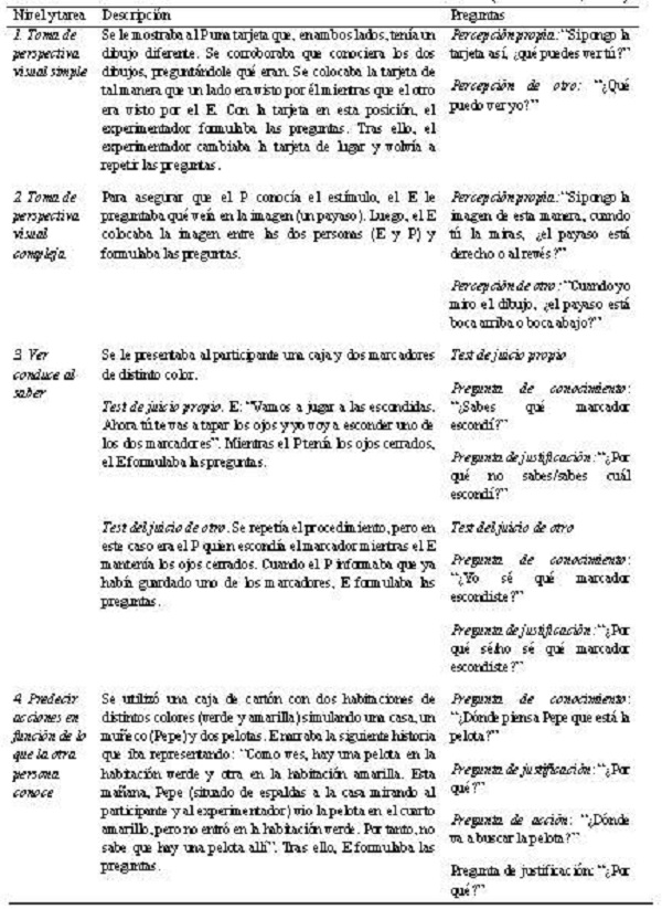 Howlin et al. (1999) detallaron un modelo de ToM de cinco niveles de conocimiento con el objetivo de ordenar las tareas atendiendo a su complejidad y construir un protocolo de evaluación y entrenamiento que siguiera el orden natural que ocurre durante el desarrollo evolutivo del niño. El primer nivel, denominado toma de perspectiva visual simple, se refiere al hecho de que personas diferentes pueden observar diferentes cosas. El segundo nivel, toma de perspectiva visual compleja, implica que dos sujetos pueden estar observando el mismo objeto y aun así tener un punto de vista diferente, dado que cada uno lo observa desde su propio lugar. El tercer nivel hace referencia al principio “ver conduce a saber”, el cual denota el hecho de que los individuos solo conocen aquello con lo cual han tenido experiencia directa o indirecta; mientras que el cuarto nivel, creencias verdaderas, consiste en poder comprender que otro individuo puede tener creencias que son fruto de su experiencia previa y así realizar predicciones con base en las creencias que posee. Por último, el quinto nivel, falsas creencias, involucra predecir lo que otra persona va a hacer, sabiendo que el conocimiento que tiene esa persona sobre la realidad es falso, lo cual requiere el reconocimiento de que otro individuo puede tener creencias que se diferencian de las propias y de la realidad misma (Ziv et al., 2015).