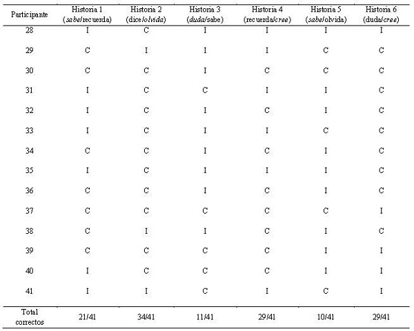 En la Tabla 410 se recogen los datos de la prueba para evaluar la comprensión de verbos mentalistas. Los resultados reflejan que la historia 5 (sabe/olvida) fue la que obtuvo peores resultados, con solo 10 respuestas correctas. En contrapartida, la historia 2 (dice/olvida) obtuvo los mejores resultados, con 34 participantes que lograron responder de manera correcta.
