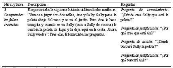 Para evaluar los cinco niveles ToM se hizo uso del procedimiento descrito en Howlin et al. (1999) y traducido en Montoya-Rodríguez y Molina Cobos (2016). Para poder llevar a cabo las tareas se requirió del uso de los siguientes materiales: una caja de cartón (la mitad pintada de verde y la otra mitad de amarillo), dos marcadores de distinto color, tres muñecos, dos tarjetas con distintos dibujos en ambas caras (auto/vaca, abuela/corazón), una tarjeta con un payaso, dos pelotas pequeñas, un vaso opaco y una cesta. Las tareas fueron aplicadas según se detalla en la Tabla 12.