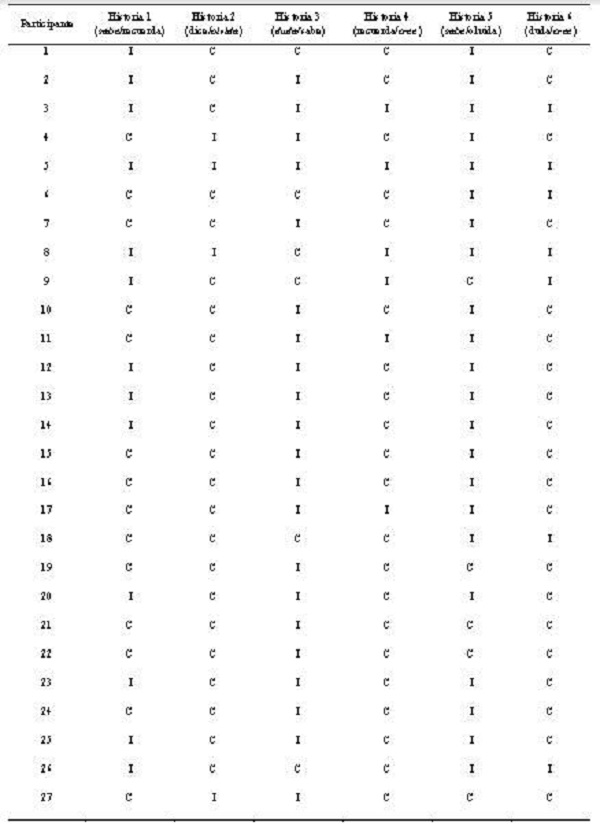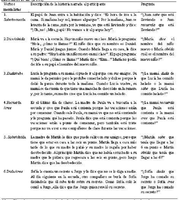Por otra parte, los verbos mentalistas fueron evaluados a través de la adaptación de la prueba propuesta por Antonietti et al. (2006), la cual consistió en la presentación de una serie de historias tal y como se especifica en la Tabla 2. Las adaptaciones fueron realizadas por la primera y tercera autora, y consistieron en reducir la cantidad de historias, reducir las opciones de respuestas en cada historia, así como modificar la modalidad de aplicación de escrito a oral.