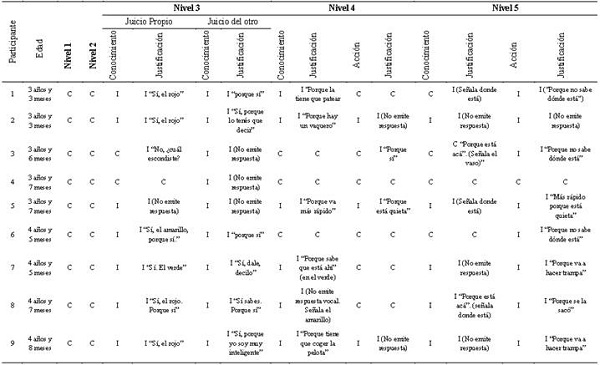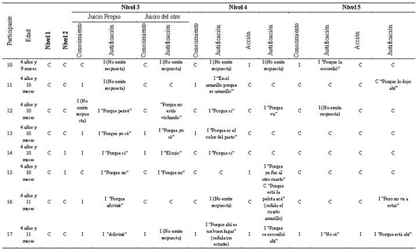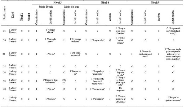 Asimismo, se destaca la dificultad de los participantes para justificar sus respuestas con respecto a los niveles de la ToM (véase Tabla 35 6 78). Un ejemplo de ello sería la elaboración de explicaciones causales, donde las respuestas más frecuentes son “porque sí” o, directamente, la no elaboración de ninguna respuesta. Estos resultados podrían atribuirse al hecho de que los participantes emplean la expresión con fines comunicativos, o bien se encuentran en la transición de usar verbos mentales con fines conversacionales a hacer atribuciones mentales genuinas. La respuesta “porque sí” podría estar indicando una suerte de precursor en el uso de verbos mentales relativos a deseos, con una función similar a la de expresiones como “porque le da la gana”, que a su vez se asemeja a “querer”, típicas de este momento del desarrollo (Pascual et al., 2008). Es interesante además notar que en la secuencia propuesta por Wellman y Liu (2004) la comprensión de deseos como estado mental es el primer punto de la progresión de tareas ToM que sugieren, anterior a los juicios sobre conocimiento y creencias.
