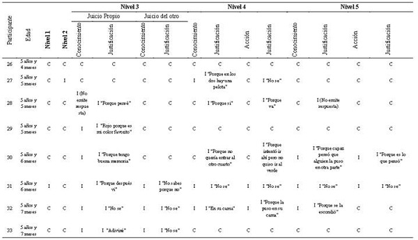 Las dificultades observadas en los participantes para justificar sus respuestas también podrían sugerir un desarrollo insuficiente de estructuras de complementación sintáctica (de Villiers, 2007; Pascual et al., 2008). Se ha demostrado que las oraciones subordinadas con complementos se asocian con la frecuencia de uso de verbos de deseo y creencia referidos a estados mentales genuinos (Pascual et al., 2008). Este tipo de verbos con frecuencia son el verbo principal en oraciones complejas que tienen oraciones subordinadas (llamadas complementos), como su objeto gramatical (Astington & Baird, 2005). Adicionalmente, los verbos mentales permiten oraciones falsas incrustadas en oraciones verdaderas, por lo que se afirma que la estructura sintáctica provee el formato necesario para representar creencias como falsas. En otras palabras, mientras la sintaxis, apenas en desarrollo hacia la edad de cuatro años, no permita representar falsos complementos, el niño no podrá generar representaciones simbólicas suficientemente elaboradas para superar interpretaciones derivadas de la experiencia directa (de Villiers, 2007; Remmel & Peters, 2009), tal como parece reflejarse en las justificaciones propuestas por los participantes del presente estudio.