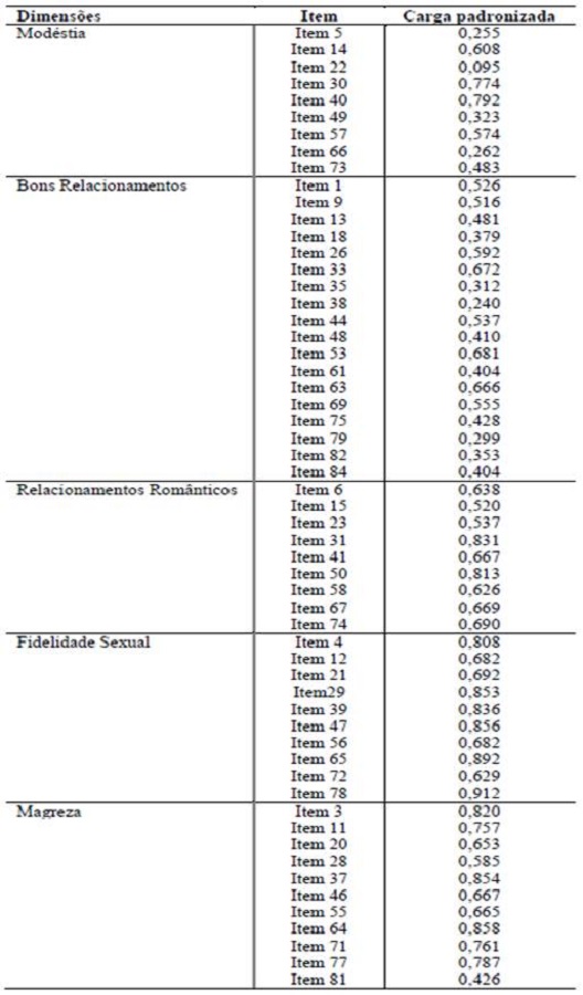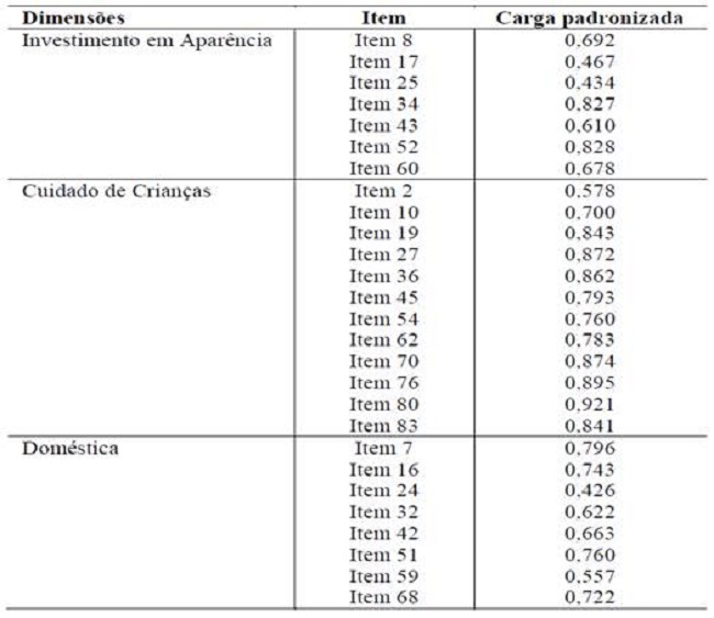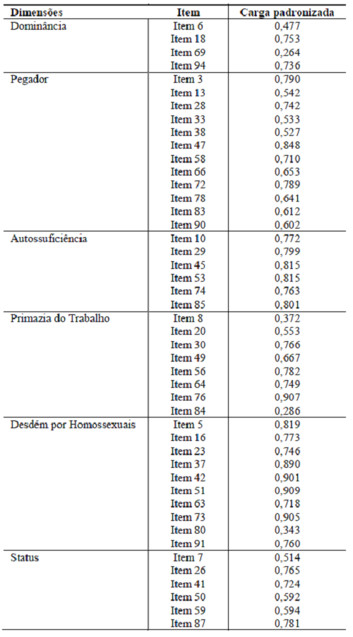 Ademais, foram identificadas cargas fatoriais fracas em alguns itens, o que resultou em seu descarte. Assim, as versões finais do CFNI e do CMNI foram compostas, respectivamente, por 65 e 86 itens. Cumpre ressaltar que a dimensão Dominância, descartada do modelo brasileiro, também apresentou índices inadequados em estudos anteriores (Cuéllar-Flores et al., 2011; Parent & Moradi, 2009). Em que pesem estes resultados, o presente estudo adiciona evidências de validade de estrutura interna dos instrumentos.