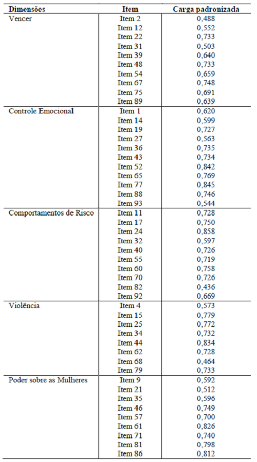 Inventário de Conformidade com as Normas Masculinas (Conformity to Masculine Norms Inventory, CMNI; Mahalik et al., 2003). O instrumento contém 94 itens agrupados em onze normas masculinas que tratam de: orientar-se a vencer, restrição e supressão emocional, propensão a comportamentos de risco, propensão a confrontos físicos, busca de poder sobre as mulheres, busca de controle sobre as situações em geral, busca de relações sexuais sem compromisso, autossuficiência, importância dada ao trabalho, aversão a ser homossexual ou ser considerado como homossexual e interesse em ser visto como uma pessoa importante. A escala de resposta é igualmente a apresentada no instrumento anterior. Exemplo de item da dimensão controle emocional: é melhor manter suas emoções escondidas. A consistência interna no estudo original, avaliada por meio do coeficiente alfa de Cronbach, variou de 0,72 (status) até 0,91 (controle emocional).