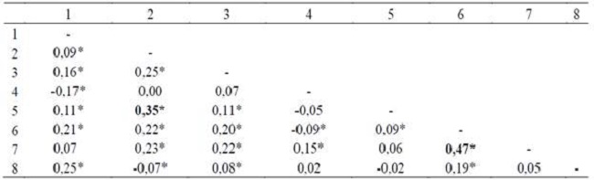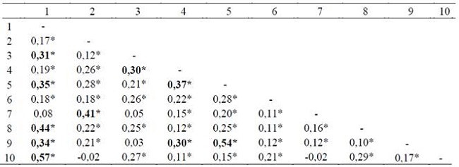 Tal como esperado pela hipótese 2, as dimensões dos instrumentos correlacionaram-se entre si. Foram identificadas correlações positivas e significativas entre as dimensões do CFNI (tabela 3), como exemplo, destacam-se as correlações entre: Cuidado de Crianças e Bons Relacionamentos (r= 0,35, p< 0,01), e Relacionamentos Românticos e Fidelidade Sexual (r= 0,47, p< 0,01).