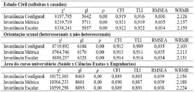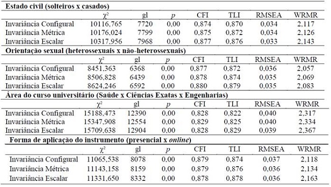 Para avaliar a invariância dos parâmetros dos itens em relação ao estado civil, orientação sexual, curso de graduação e modo de aplicação, foram conduzidas análises fatoriais multigrupos (Damásio, 2013). Entretanto, para o CFNI não foi possível a comparação quanto ao modo de aplicação do instrumento, pois o número de participantes em cada um dos subgrupos (presencial e online) estava desequilibrado.