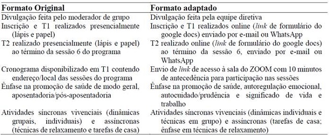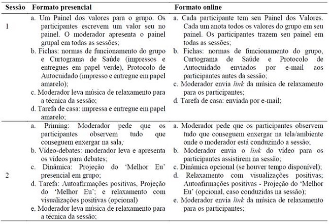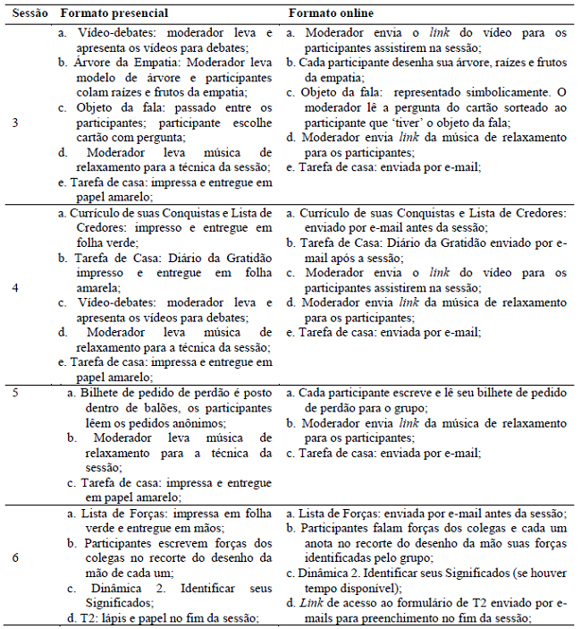 A partir da avaliação de processo, conforme registros do diário de campo do moderador, foram introduzidas mudanças na estrutura, em dinâmicas e materiais utilizados nas sessões, de modo a viabilizar a implementação online, conforme ilustrado na tabela 2a2b.