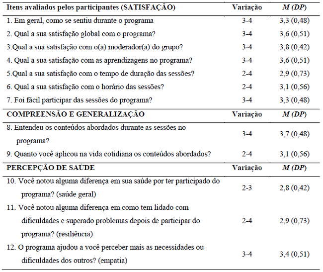A tabela 3 apresenta variações de escores (entre 1 e 4), médias (M) e desvio padrão (PD), das questões objetivas das avaliações dos participantes quanto à satisfação com o programa e com moderador, compreensão e generalização dos conteúdos abordados no programa e questões de saúde, conforme autorelato dos participantes.