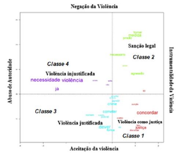 Ao analisar o plano fatorial (Figura 1 ), observa-se que o eixo vertical organizou os posicionamentos dos participantes em função da aceitabilidade da violência policial. Na parte superior do plano fatorial, os argumentos apresentados nas classes 2 (sanção legal) e 4 (violência injustificada) rejeitam a violência policial na medida em que essa ação foi considerada como desnecessária e injustificável. Na parte inferior do plano fatorial, os argumentos apresentados nas classes 1 (violência como justiça) e 3 (violência justificada) defendem a ideia de que a violência é aceitável, sendo compreendida como uma forma de justiça, mais precisamente como uma resposta à criminalidade, dada a ineficácia do sistema judicial.