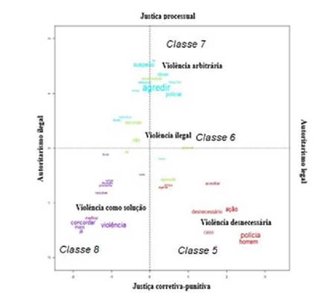 Na análise do eixo horizontal, os posicionamentos organizam-se em torno da ilegalidade do uso da força e apresentam argumentos que vão do autoritarismo ilegal ao autoritarismo legal. No lado direito do plano fatorial, a classe 5 ancora seus posicionamentos no autoritarismo legal. Embora as classes 6 (violência ilegal) e 7 (violência arbitrária) estejam mais posicionadas próximas ao centro do plano fatorial, elas apresentam conteúdos qualitativamente semelhantes aos da classe 5. Nos discursos dessas classes, a ação policial, ao aplicar força excessiva na detenção do suspeito, contradiz os princípios de isonomia e direito, ignorando práticas que estejam em conformidade com lei. Em contraste, no lado esquerdo do plano fatorial, a classe 8 (violência como solução) ancora seus posicionamentos no autoritarismo ilegal ao defender a punição independente das regras e leis que orientam a prática profissional dos policiais. Nessa classe, observa-se que a ação violenta da polícia é percebida como uma medida disciplinar capaz de corrigir as ações criminosas e evitar eventos futuros desta natureza.