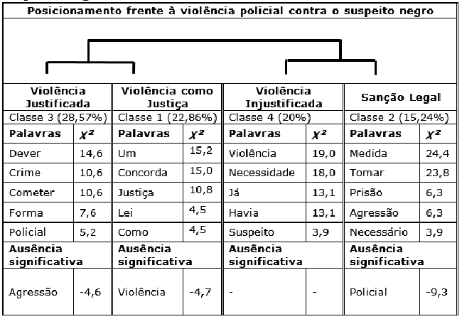 A classe 3, denominada violência justificada, é a de maior representatividade no corpus (28,57 %) e apresenta repertórios que discordam de ações agressivas como parte do dever do policial, no entanto entendem a agressão como consequência do crime cometido pelo suspeito. A palavra que representa a ausência significativa nessa classe é agressão, indicando que a violência praticada é percebida como necessária. Neste sentido, os argumentos tendem a justificar a violência policial. Como por exemplo: “Não é dever do policial agredir o homem, no entanto ele deve sofrer as consequências dos seus atos pela forma como cometeu o crime” e “Os policiais não devem agredir, mas o indivíduo está pagando por cometer um crime”.
