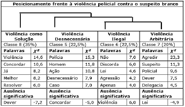No que se refere à concordância com a violência policial (classes 1, 3 e 8), os participantes apresentaram argumentos semelhantes para ambos os suspeitos (branco e negro). As justificativas utilizadas para essa concordância são declaradas através de um repertório autoritário que visa defender-se contra um inimigo iminente, além do combate à criminalidade que, justificaria o uso da violência policial (Jackson et al., 2018; Lemgruber et al., 2017). Nestes julgamentos, a ação policial, mesmo em desacordo com a Lei, é percebida como eficaz e se fundamenta no seu emprego de caráter punitivo (Farias et al., 2017). Esse aspecto é importante porque a percepção de eficácia da ação policial é um fator legitimador da violência policial (Jackson et al., 2020).