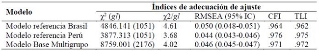 Con estos análisis preliminares se demostró que tanto el modelo SEM de referencia de Brasil como el de Perú se ajustan a los datos, pero los coeficientes de ruta estimados difieren entre los dos modelos, proseguimos a evaluar si la variancia en los coeficientes de trayectoria estructural implicaría que la pertenencia a la población modera las relaciones causales en ellos. Para eso se estimó un modelo SEM multigrupo configuracional con las variables tener o no tener hijos, grado de instrucción, tener o no tener pareja, renta familiar, religiosidad y positividad; donde todos los coeficientes en el modelo se liberaron en ambos grupos simultáneamente. Este modelo configuracional sirvió como modelo base para comparaciones de modelos posteriormente. Los índices de juste de ese modelo base fueron adecuados (Tabla 1).